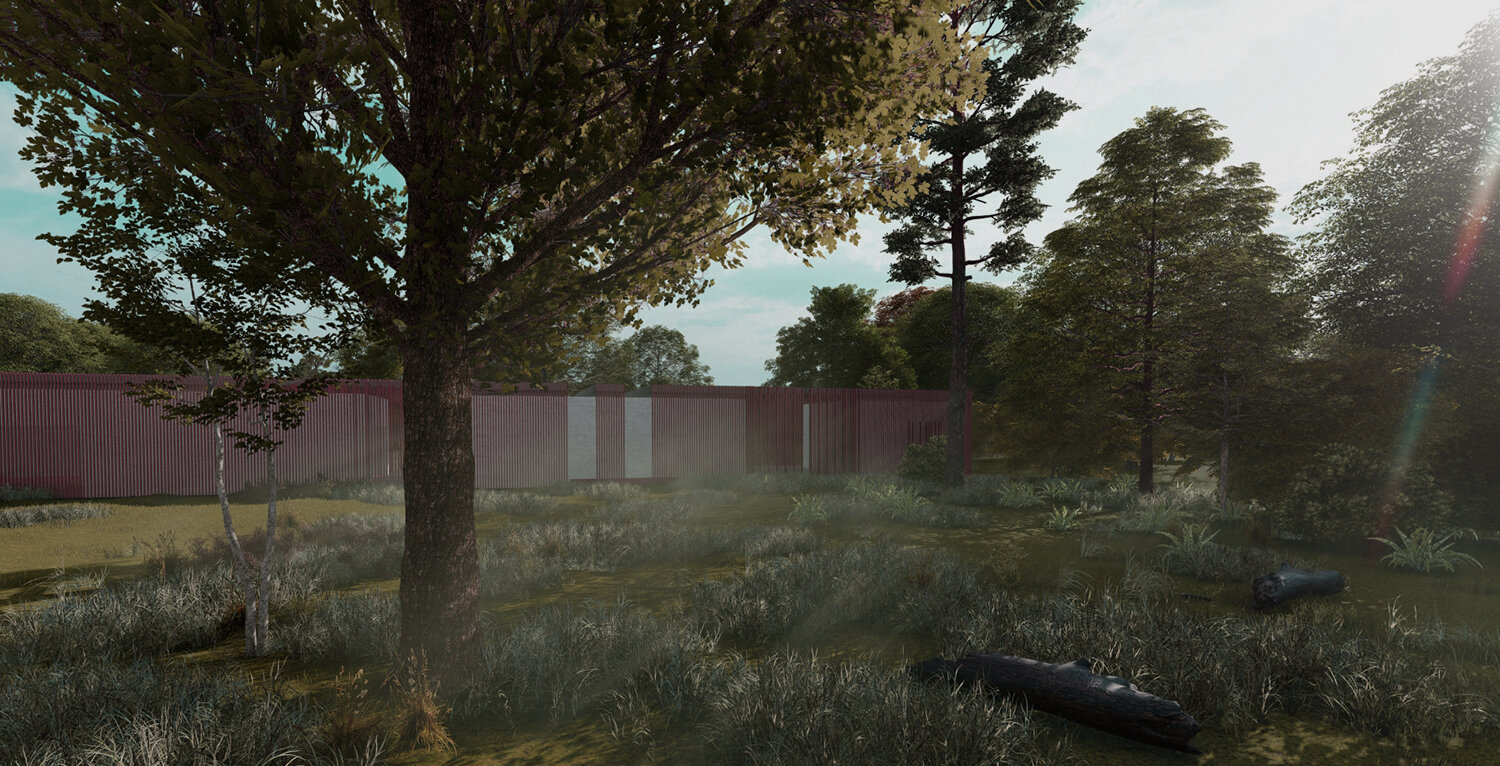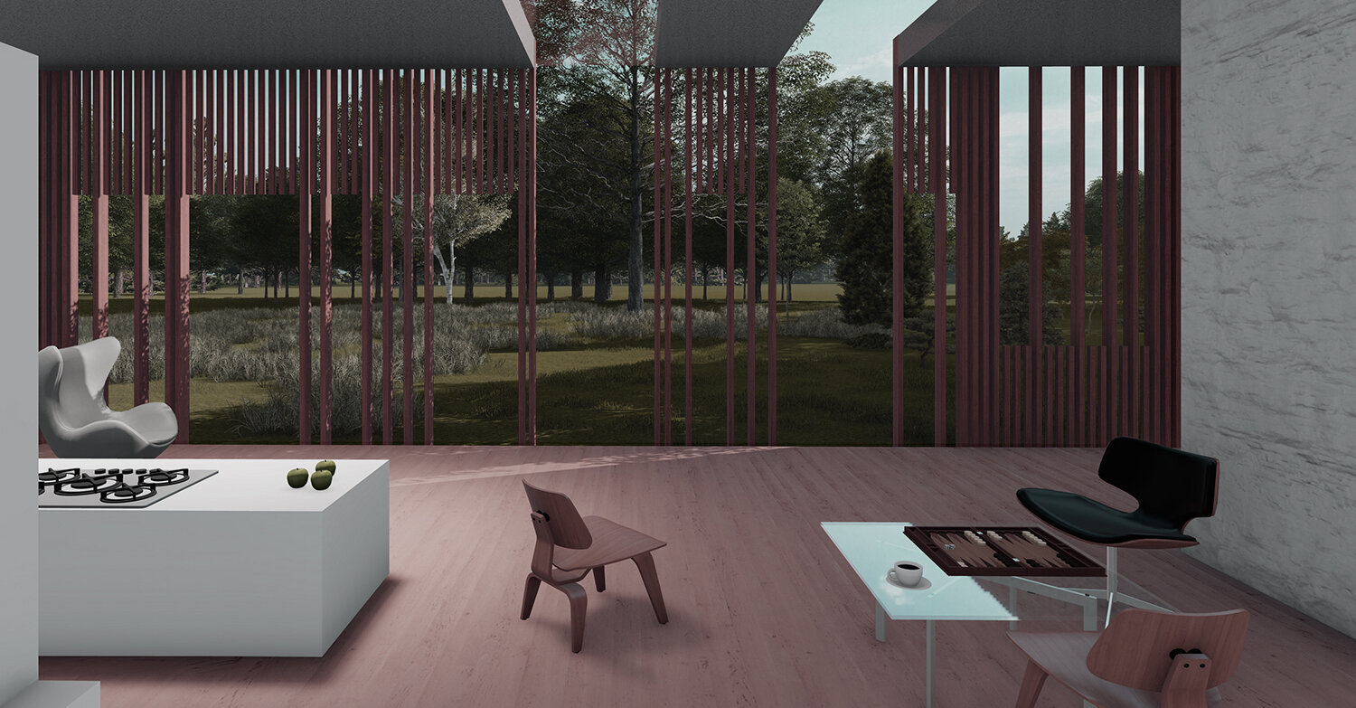 A beautiful meadow in Illinois inspired the linear arrangement of this home for a retired couple. The challenge of providing solar protection on the eastern elevation meant merging a staccato composition of wood fins with a fully glazed enfilade between all the dwelling rooms.
