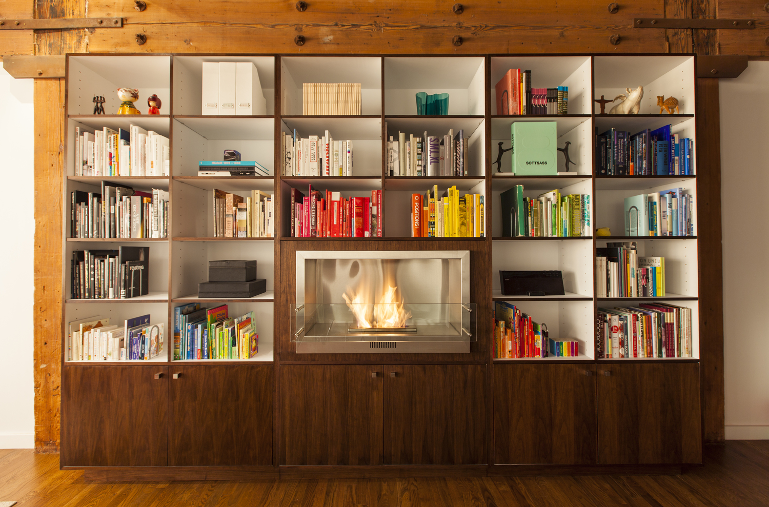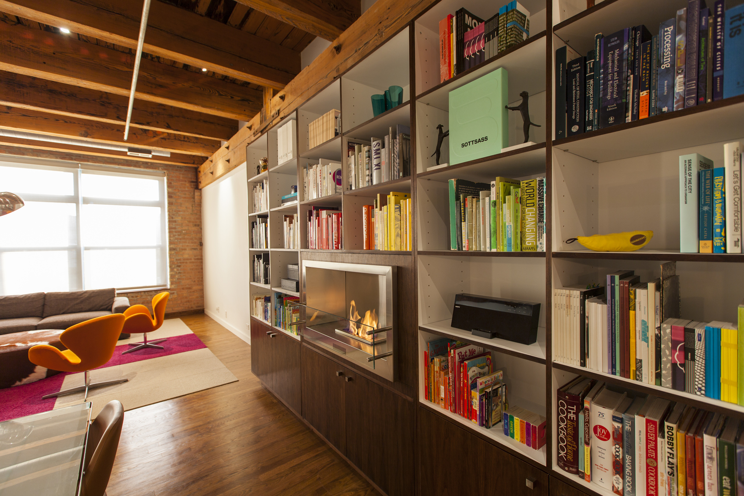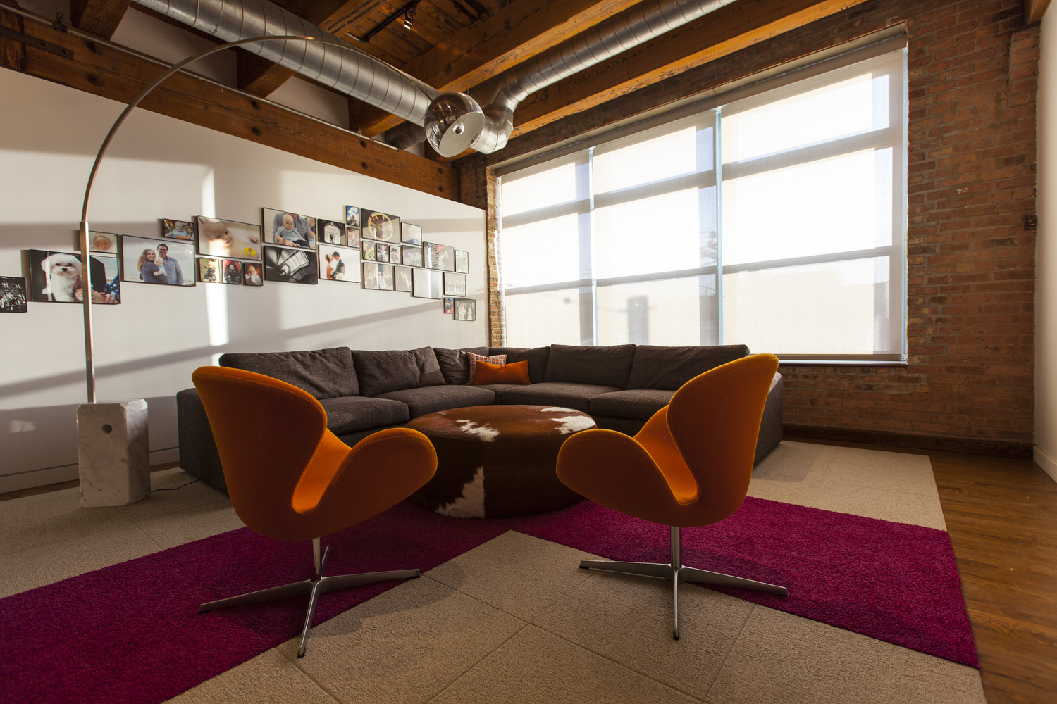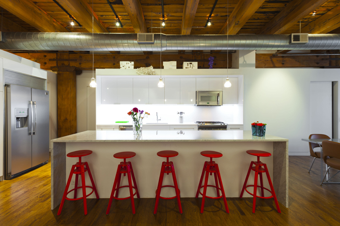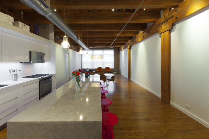 Peoria Street Condo is the complete redesign of a 1500 SF loft in Chicago’s West Loop. The design explores the extrusion and layering of multiple boxes into the main living space with carving and subtraction in the private spaces in order to both reveal the substantial original 1915 timber structure and challenge the perception of solid and void relative to that structure.