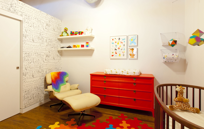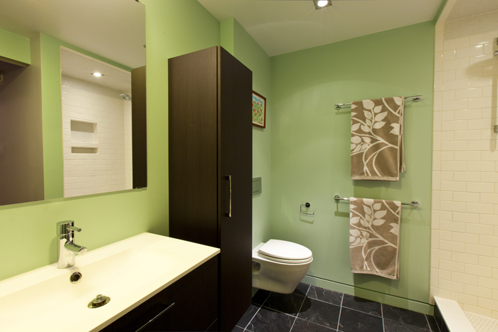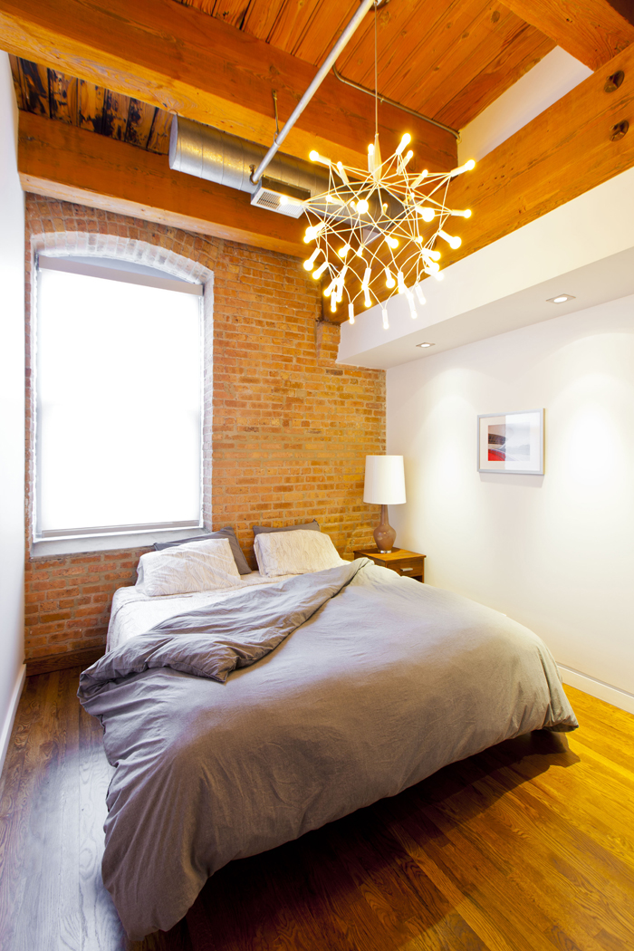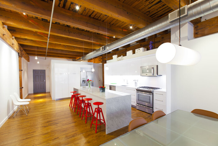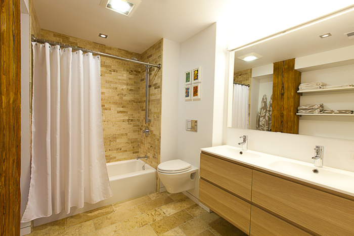 The two bedroom two bathroom space features all new lighting throughout, refinished and salvaged wood floors in the main living space, and pocket doors with Italian door hardware. the kitchen is highlighted by a 10 foot carrara marble island with breakfast bar opposite quartz countertops complete with undercount zero radius stainless steel sink. White gloss cabinetry with Finnish drawer pulls, a white penny round backsplash, and stainless appliances finish the space. The bedrooms and main living space are articulated with playful pendant lights from Moooi, Patrick Townsend, and Sofie Refer and recessed lighting that mimics door hardware. Both bathrooms feature wall mounted low flow toilets while the guest bathroom is finished with slate floors and a subway tile shower carved from the box form that extrudes into the kitchen. The master bathroom is finished with travertine on the floors and shower walls, white stained oak cabinetry and a cast iron tub.