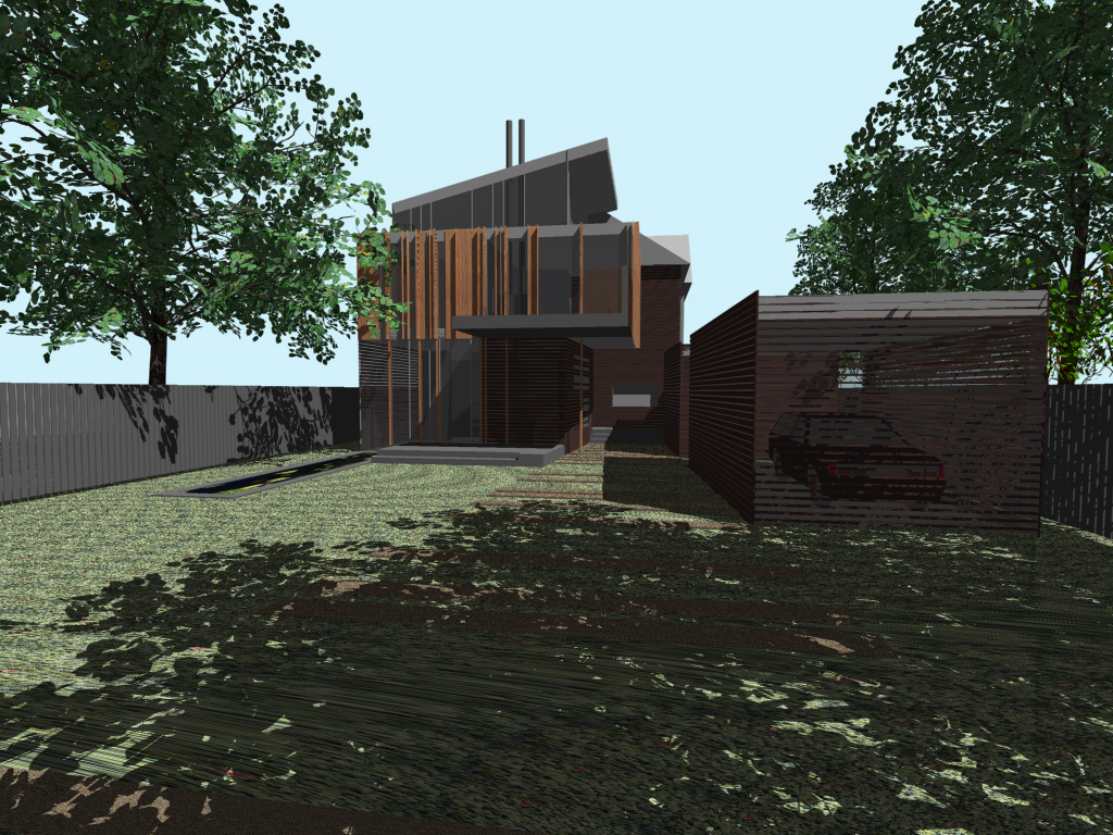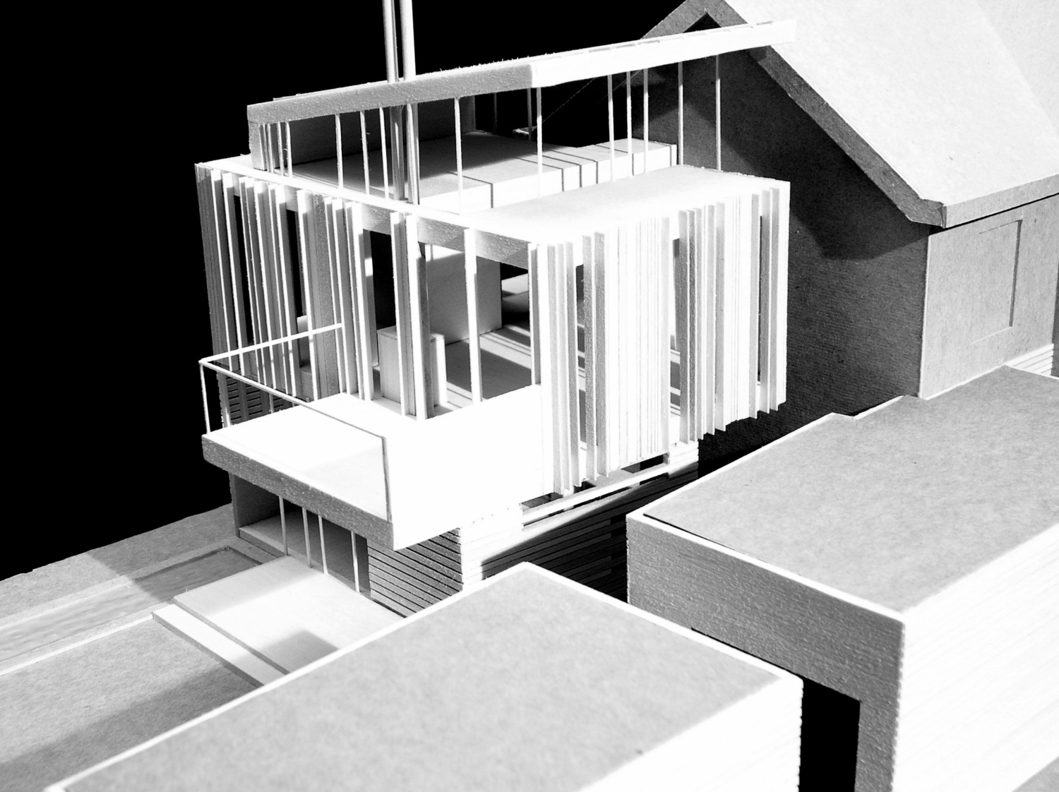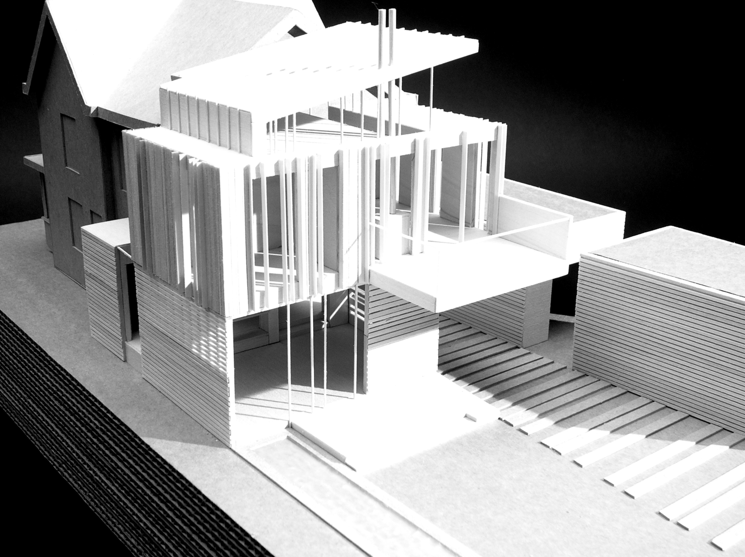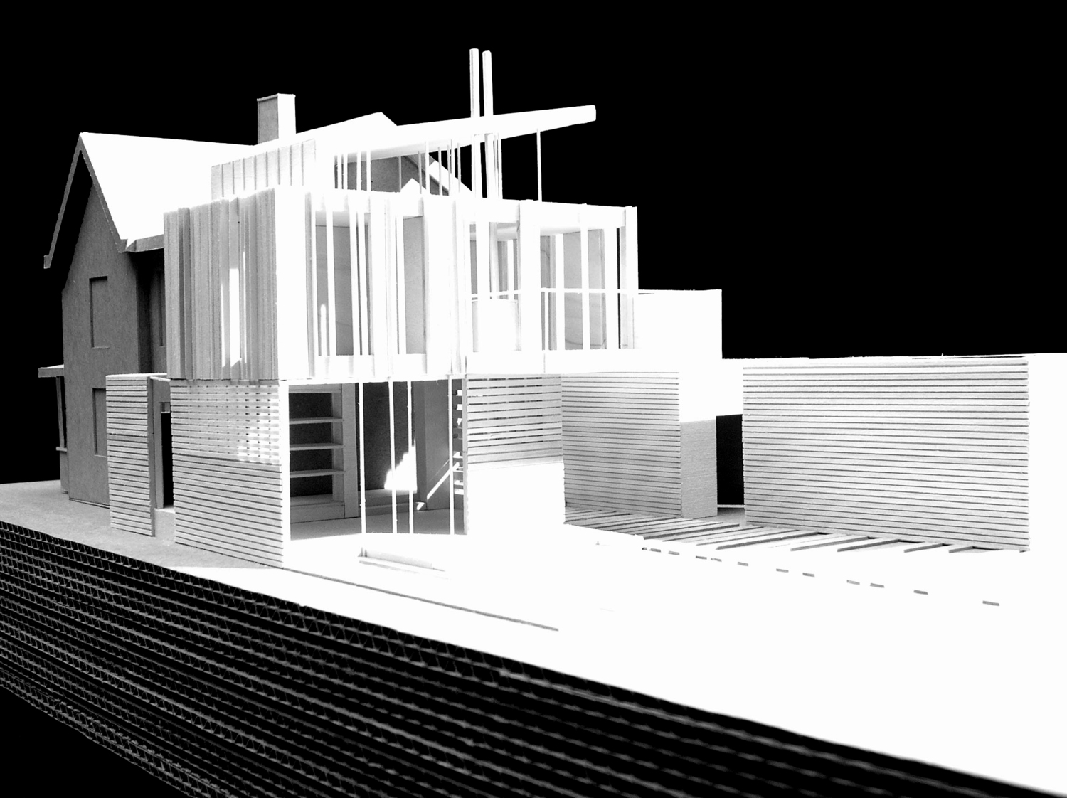 This addition consists of a new 2-car garage, family room, bathroom, and master bedroom suite. Striking views of the Little Miami River Valley conflict with the western solar orientation of this suburban Cincinnati site. We proposed vertical cedar fins to negotiate the view and the sun. These fins were absorbed from their role in solar performance into the structural plane of the faced. An intentionally ambiguous system: sometimes a fin is structural, sometimes for shading, sometimes a rain-screen, sometimes all or neither. Altogether the wood fins are subsumed into a rhythmic cladding which seeks to agitate perceptions of function and decoration.