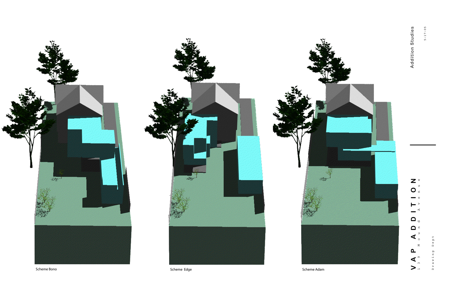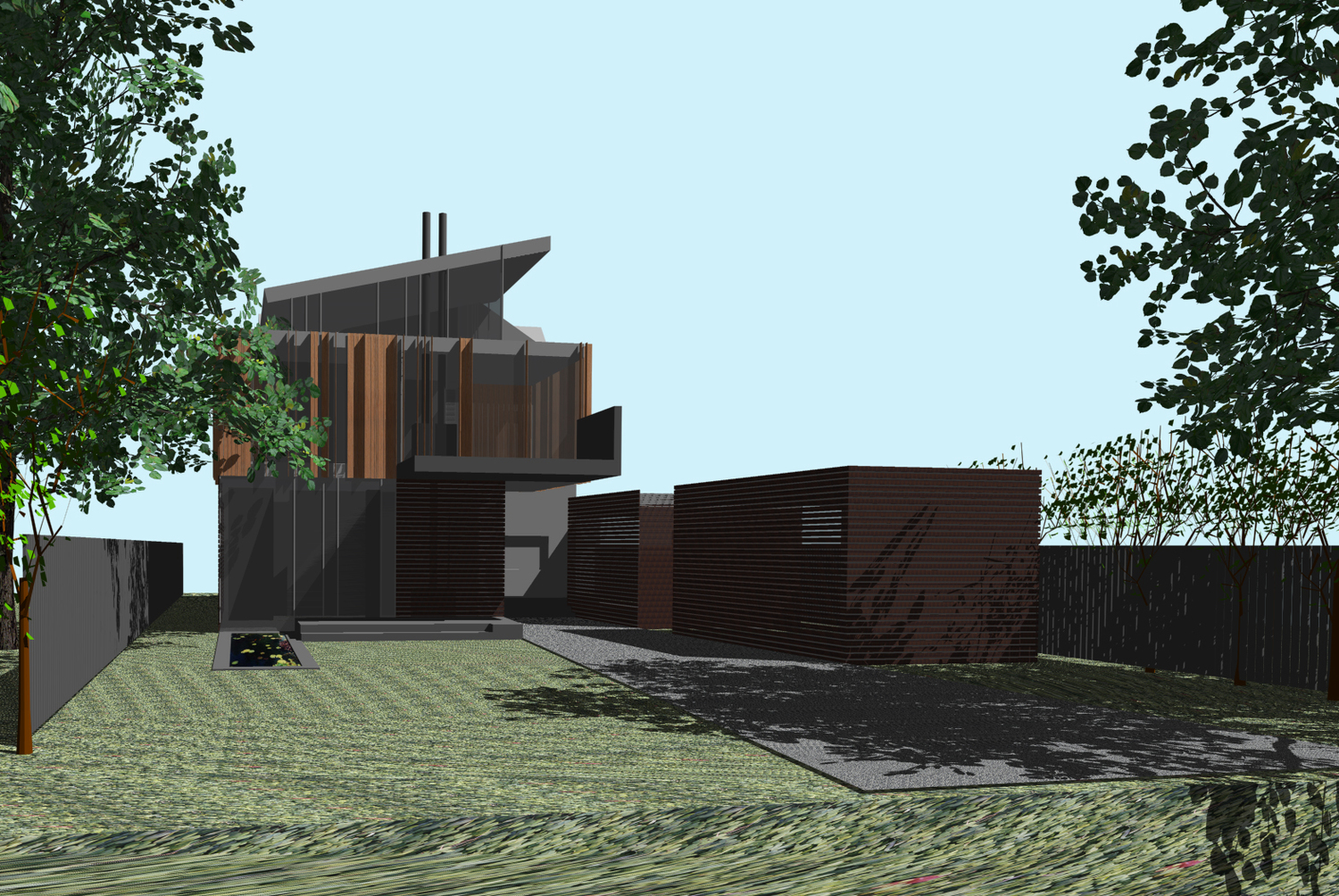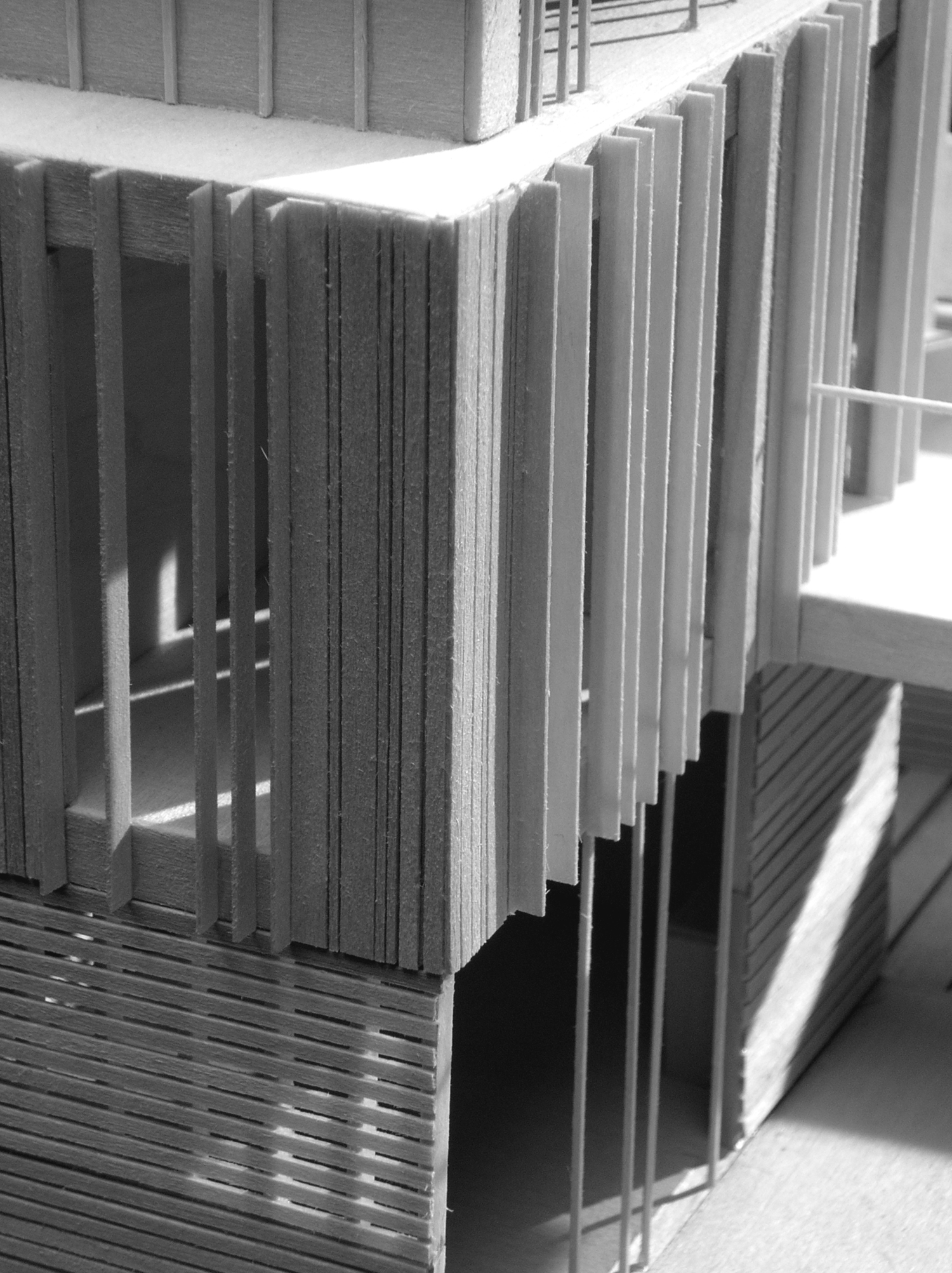 This addition consists of a new 2-car garage, family room, bathroom, and master bedroom suite. Striking views of the Little Miami River Valley conflict with the western solar orientation of this suburban Cincinnati site. We proposed vertical cedar fins to negotiate the view and the sun. These fins were absorbed from their role in solar performance into the structural plane of the faced. An intentionally ambiguous system: sometimes a fin is structural, sometimes for shading, sometimes a rain-screen, sometimes all or neither. Altogether the wood fins are subsumed into a rhythmic cladding which seeks to agitate perceptions of function and decoration.